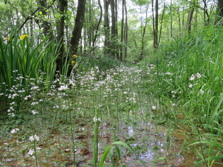 Uitbundig bloeiende Waterviolier in de Zompesloot. Door de sterke kwel in de Zompesloot kan Waterviolier hier slootbedekkend bloeien. In en langs de sloot komt ook Grote boterbloem, Gewone dotterbloem, Bosbies, Bittere veldkers en Paarbladig goudveil voor. Deze plantensoorten duiden allemaal op de aanwezigheid van kwel.