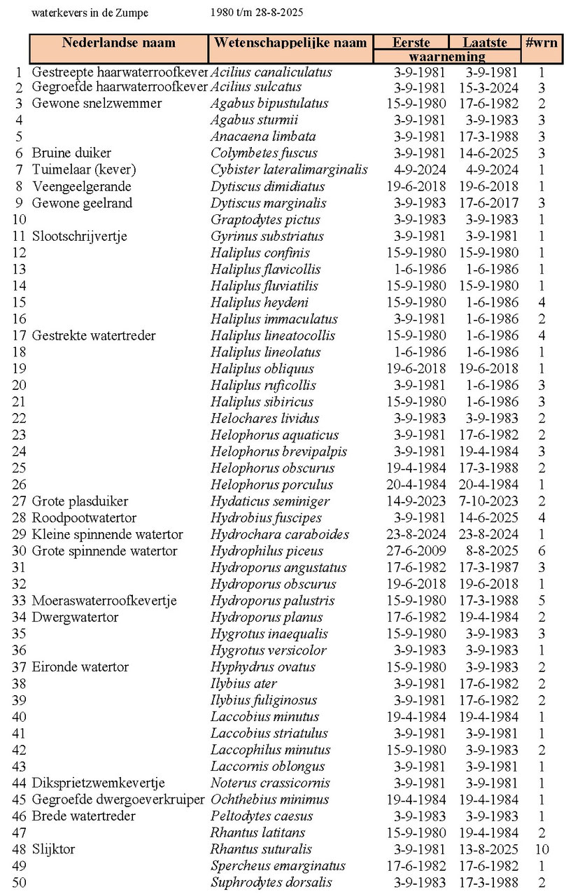 In de onderstaande tabel zijn de gevonden soorten in deze periode opgesomd. In totaal zijn 50 soorten waargenomen.
